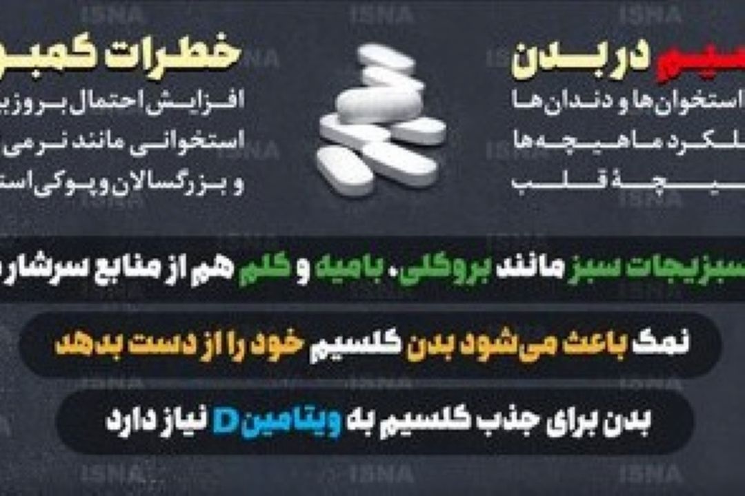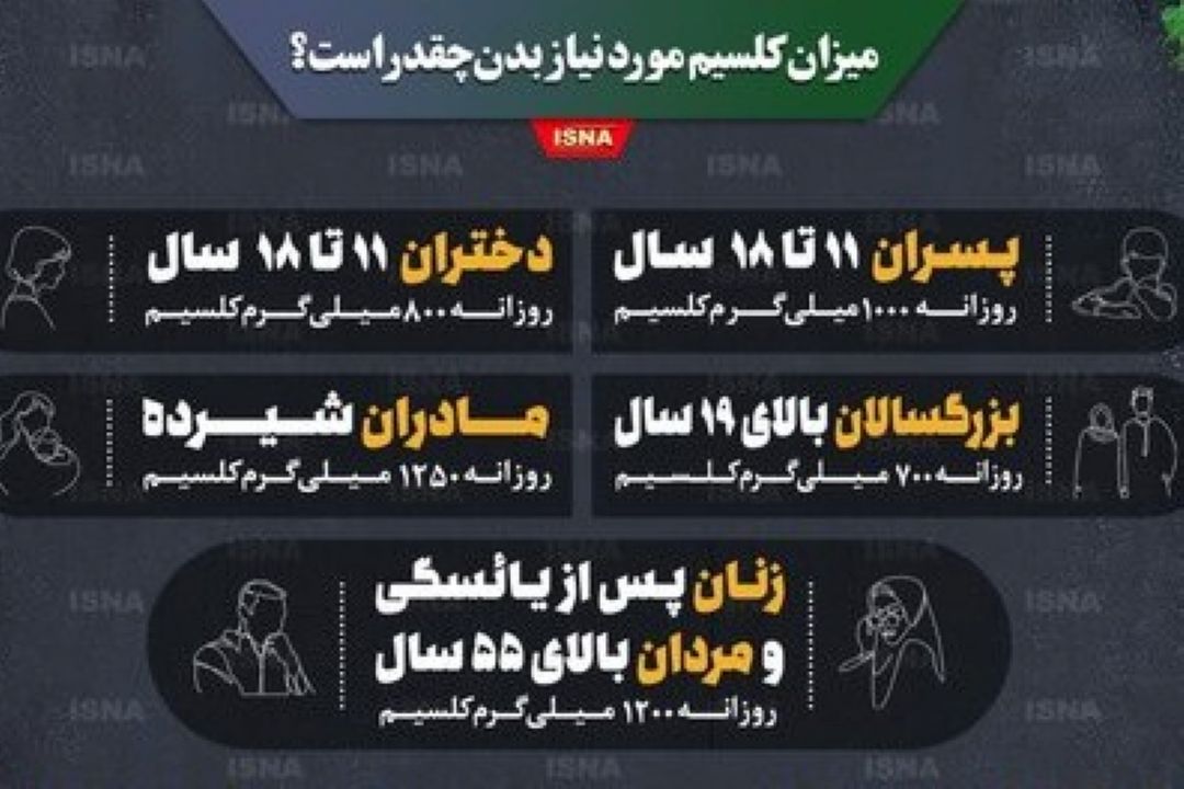 اما میزان كلسیم بدن باید چقدر باشد؟ این عدد برای افراد مختلف، متفاوت است. مثلا میزان كلسیم مورد نیاز بدن برای پسران و دختران با هم متفاوت است یا نیاز مادران به كلسیم در دوران شیردهی افزایش مییابد. در این اینفوگرافیك با میزان مورد نیاز بدن به كلسیم، نقش آن در بدن انسان و خطرات كمبود آن آشنا میشویم.