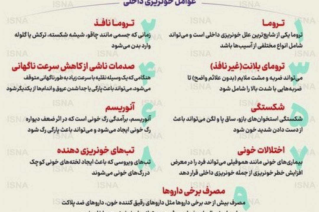 علل خونریزی داخلی، همچون علائم و نشانههای آن، متفاوت است. در برخی موارد یك عامل خارجی مانند وارد شدن ضربه به بدن موجب خونریزی میشود، در حالیكه در برخی موارد بیماری یا ضعف ساختاری در بدن، عامل بروز این عارضه است. در این اینفوگرافیك به برخی از مهمترین علائم و عوامل خونریزی داخلی اشاره شده است.