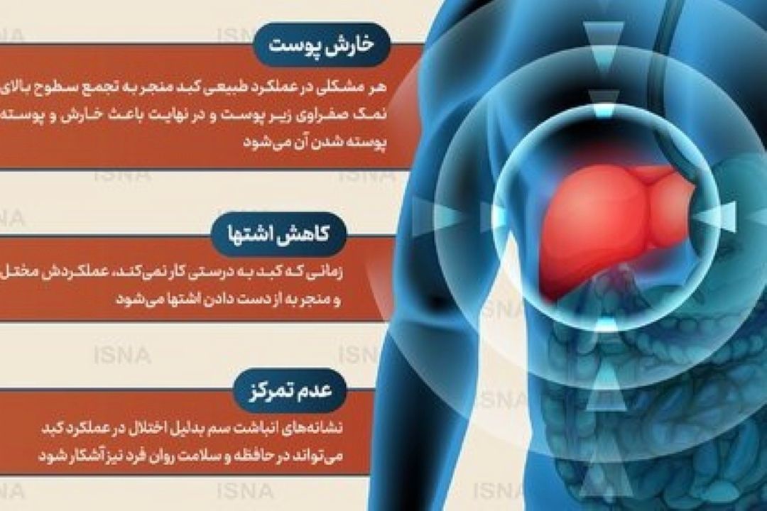 و حتی كار به پیوند عضو یا حتی مرگ برسد. از این رو شناسایی علائم مربوط به اختلال عملكرد كبد، ضروری است. در این اینفوگرافیك به پنج نشانه كه میتواند به نارسایی كبد منجر شود اشاره شده است.